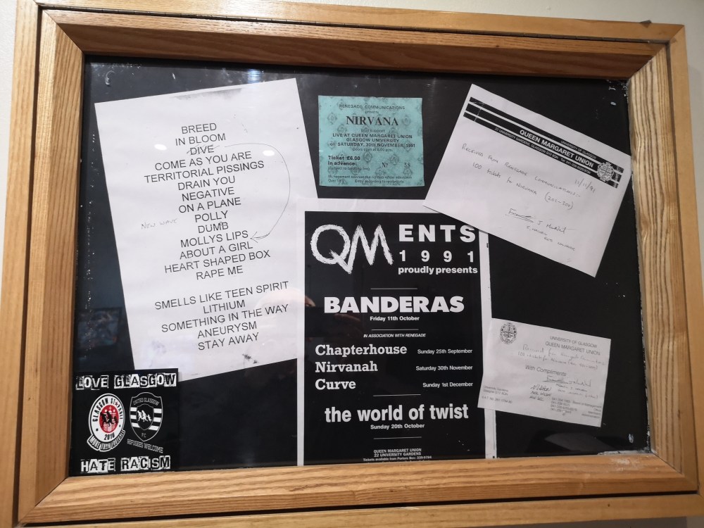 Our most iconic gig is probably Nirvana and I would encourage you to read Andy Bollen’s Nirvana Diaries with a full chapter on the gig if you want to get a feel for it. Andy was the drummer in the support band, Captain America, who then went on to tour with Nirvana. The setlist and promotional material are framed and on my office wall. The setlist appears to be Kurt Cobain’s with his footprint on the back, if so kerching for QMU if ever needed! In 2015 Dave Grohl’s setlist sold for £5625 https://www.bonhams.com/auctions/21947/lot/305/#/